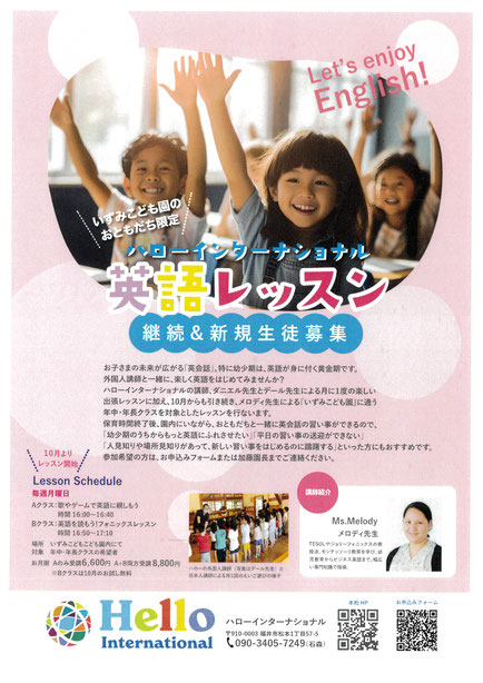 生まれてから7年の間に実に多くのことを身につける幼児期のこどもにとって まず第1言語である日本語の習得が最優先で、母国語がしっかり根付いてから第2言語を習得することが望ましい ということを踏まえながらも、これから未来を生きていく子どもたちに国際的な感覚は大切だと考えております。これまでも時々英語で交流する機会を作ってきましたが、今年度より継続的に遊びの中で異文化に触れる機会をつくっていきたいと思います。そこで、幅広い年齢のお子さんの英語教育を長期にわたり実践され、自身も留学やご自身のお子さんの英語教育を経験しながら学び続けておられるハローインターナショナルの石森梨絵先生たちとともに 遊びから学ぶ幼児期の特性を生かし、将来楽しみながら学びへと向えるよう、子どもたちにとって楽しい時間をつくっていきたいと思います。